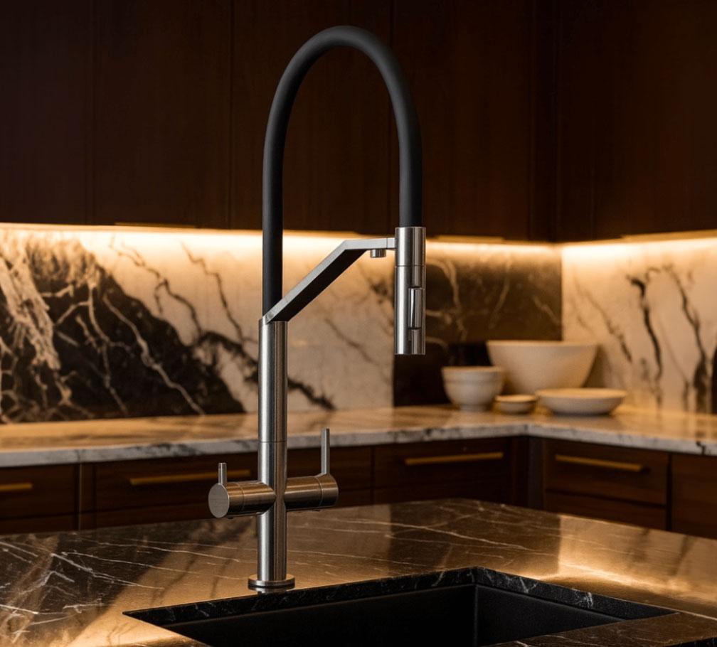 The Aurum Collection represents the future of Meissen’s kitchen design — bold, architectural, and unmistakably luxurious. With sculptural high-arch designs, matte black flexible spouts, and our signature HydroSense™ Cartridges and AeroMax™ Aerators, Aurum seamlessly blends ergonomic performance with striking form.