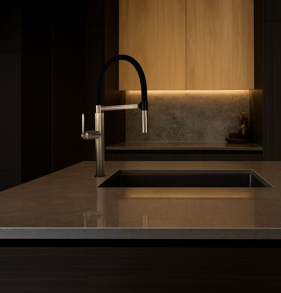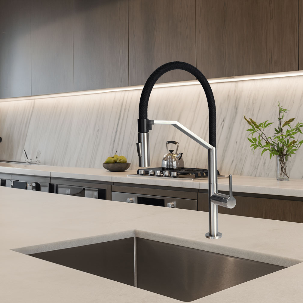 Aurum Studio – a boldly architectural, high-arch mixer with a flexible matte black spout for ergonomic performance.